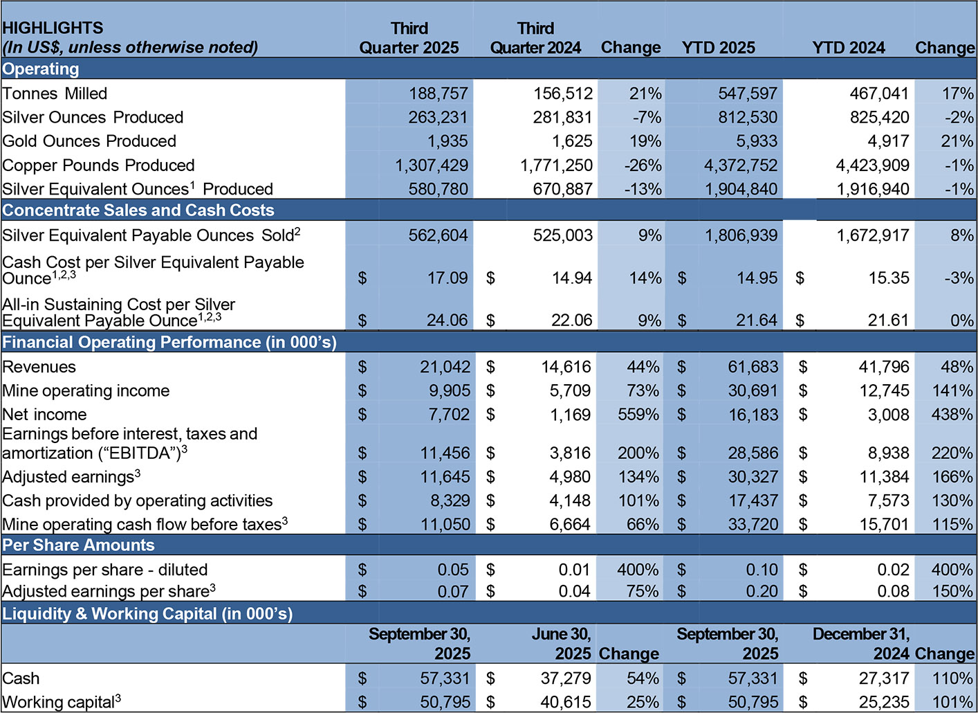 The financial results in this news release include references to non-IFRS Accounting Standards measures. These measures are used by the Company to manage and evaluate the operating performance of the Company’s mining operations and are widely reported in the silver and gold mining industry as benchmarks for performance, but do not have standardized meanings prescribed by IFRS. For a reconciliation of non-GAAP and GAAP measures, please refer to the “Non-IFRS Accounting Standards Measures” section of the Company’s MD&A dated November 6, 2025 for the nine months ended September 30, 2025, which is incorporated by reference within this news release and available on SEDAR+ at www.sedarplus.ca.
