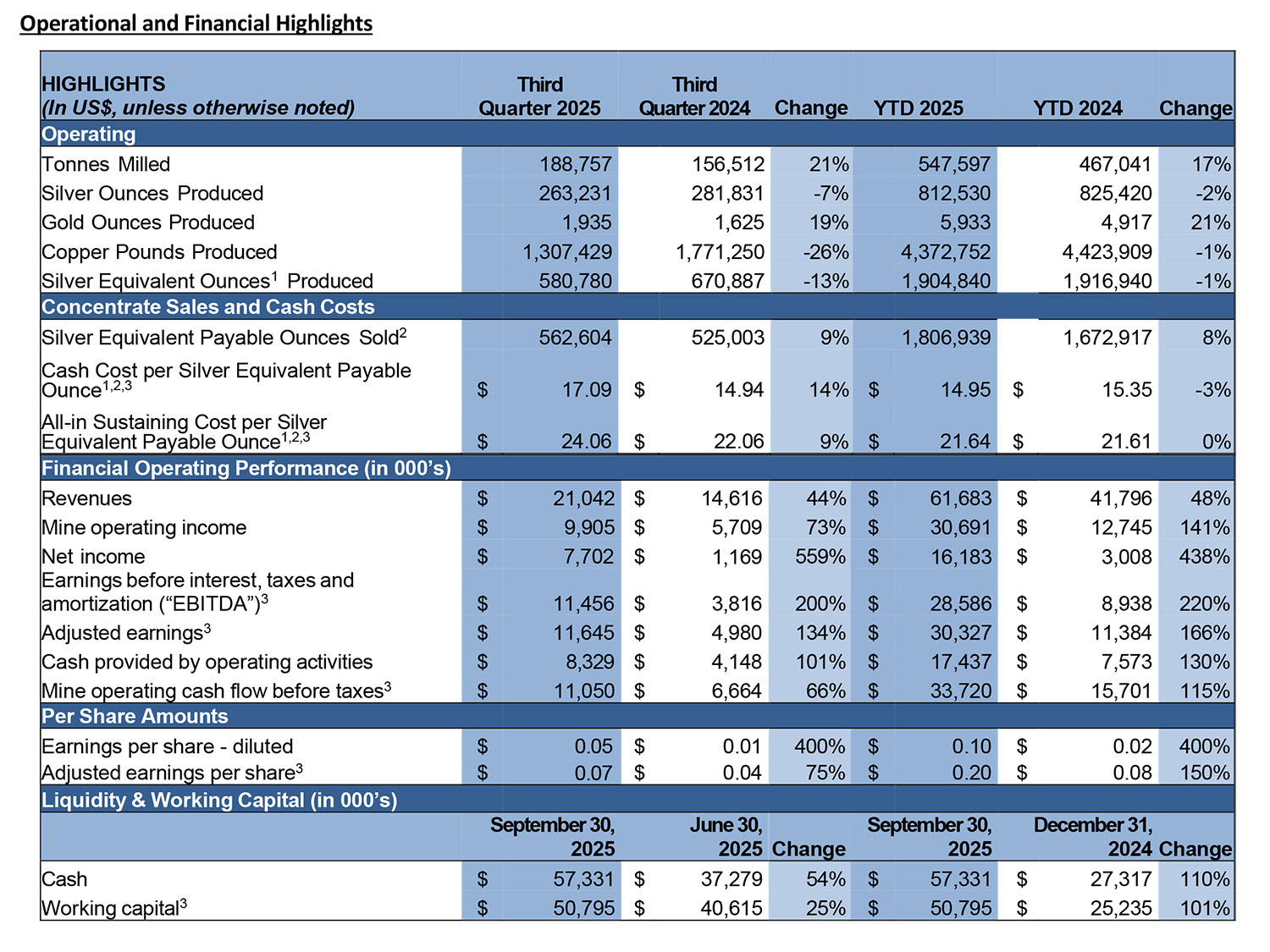 The financial results in this news release include references to non-IFRS Accounting Standards measures. These measures are used by the Company to manage and evaluate the operating performance of the Company’s mining operations and are widely reported in the silver and gold mining industry as benchmarks for performance, but do not have standardized meanings prescribed by IFRS. For a reconciliation of non-GAAP and GAAP measures, please refer to the “Non-IFRS Accounting Standards Measures” section of the Company’s MD&A dated November 6, 2025 for the nine months ended September 30, 2025, which is incorporated by reference within this news release and available on SEDAR+ at www.sedarplus.ca.