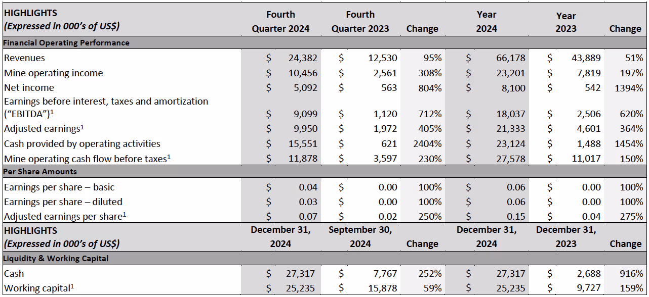 • Record Revenues: The Company realized revenues of $66.1 million, an increase of 51%, driven by improved production and sales volumes, as well as higher realized metal prices in 2024