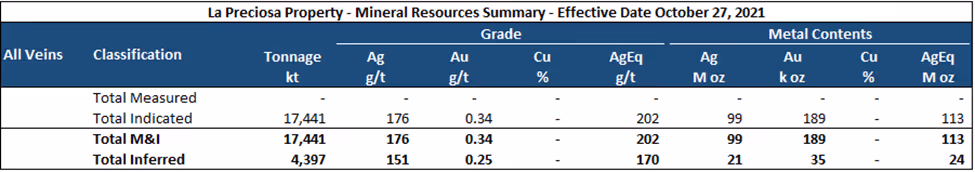 - Mineral resources for La Preciosa are estimated at a cut-off grade of 120 g/t AgEq.
