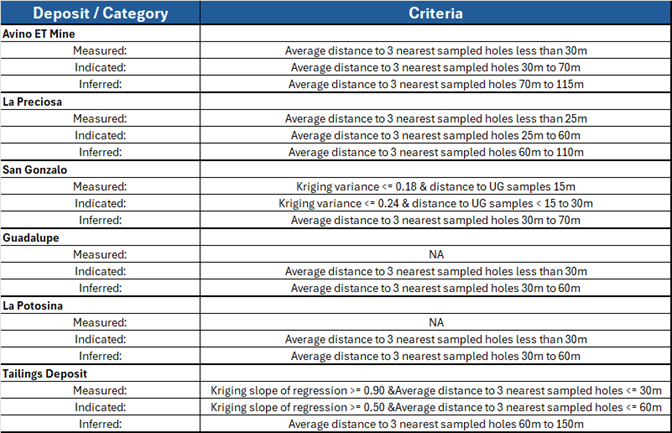 Mineral resources were estimated by ordinary kriging, optimized using kriging neighbourhood analysis and verified by means of nearest neighbour and inverse distance methods, swathplot comparisons of estimates and visual inspections. Block models were created for the San Gonzalo, and Avino Vein Systems ET, Guadalupe, La Potosina, La Preciosa and the Oxide Tailings deposit, and estimates were made using industry standard techniques.