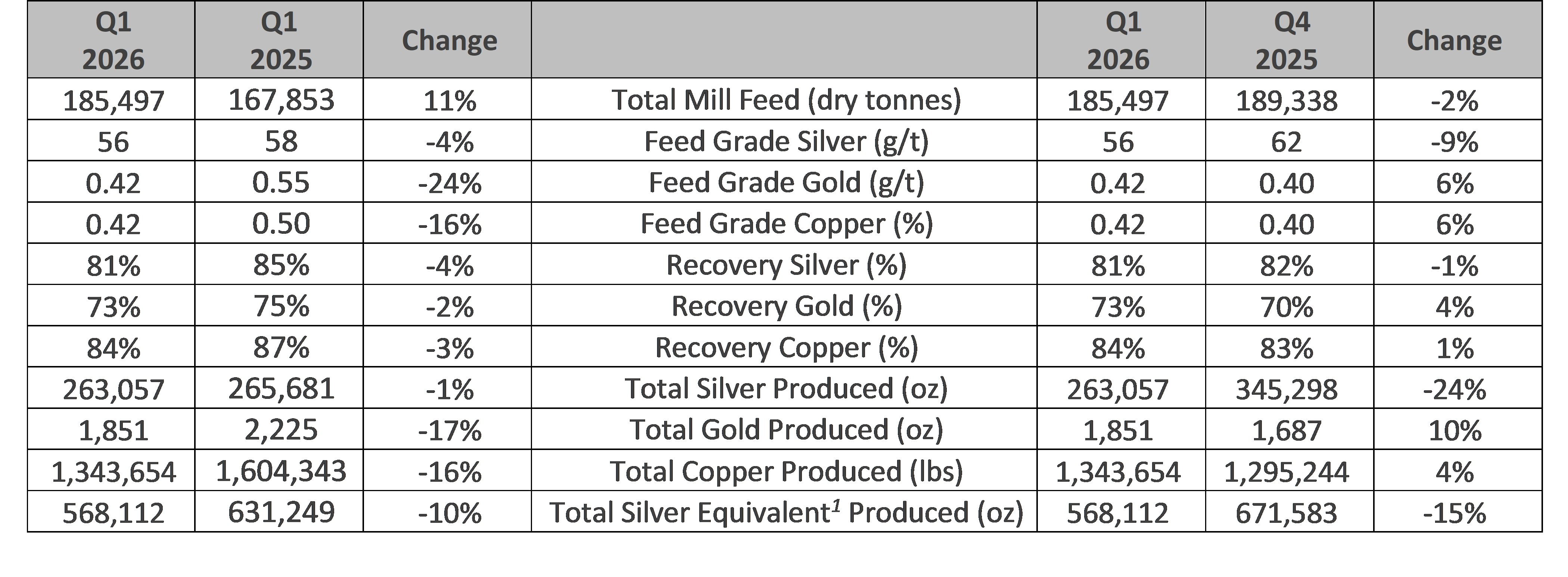 Silver equivalent or “AgEq” was calculated using metal prices of $45.30 per oz Ag, $3,929 per oz Auand $4.85 per lb Cu. These metal prices are based on the Company’s 2026 budget as approved by the Board of Directors, and previous periods have been recalculated using these prices for comparability purposes. Calculated figures may not add up due to rounding