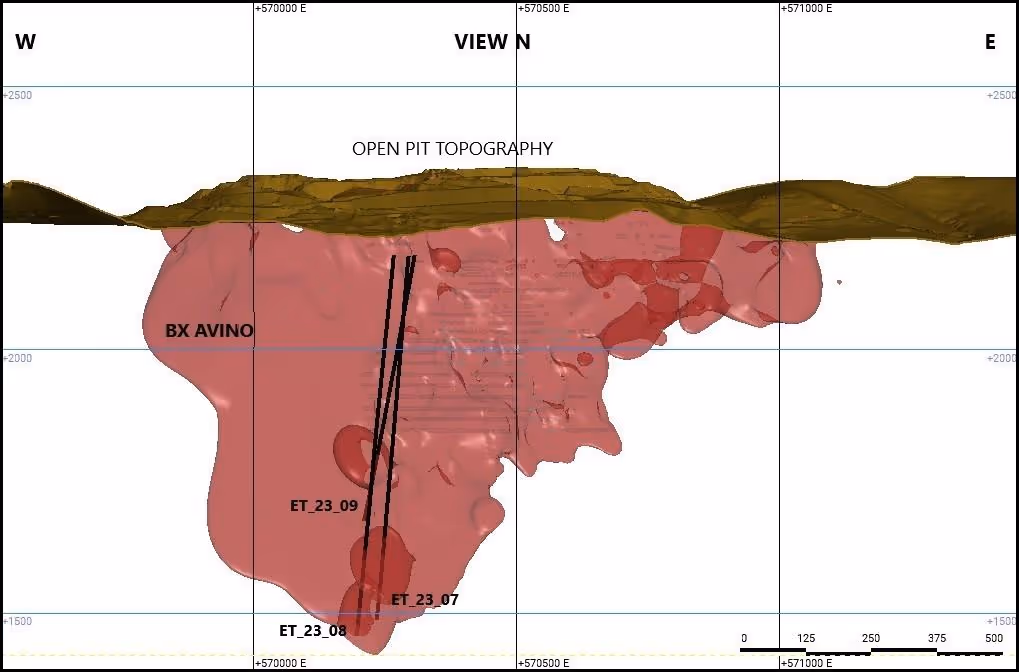 “We stepped out, at depth and along strike, with Hole ET-23-09 and were handsomely rewarded with the best drill hole in the Company’s 55-year history,” said David Wolfin, President and CEO. “The exceptionally wide and very high, silver, gold and copper grades are extremely encouraging for our continued exploration of the Avino vein and associated stockwork and breccia at depth and suggests a much more complex mineralization system. We are still open along strike and at depth and we will continue to try to understand the source of the mineralization as we explore for the source intrusive, porphyry or phreatomagmatic interface. The drill intercept widths are in line with our understanding of the Avino vein and represent minable areas to be contemplated for the future of the mine with grades that are almost 5 times the current cutoff grade.”