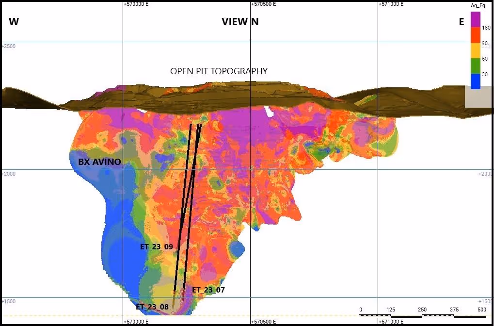 - Hole ET 23-07: 230 AgEq g/t over 11 metres true width