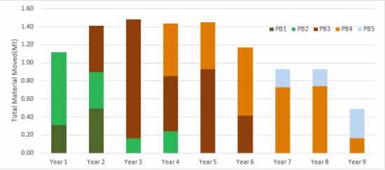 The mine life of the tailings deposit is expected to be approximately 9 years. The mining rate will ramp up to 1.4Mt in years 2 to 5 to accommodate a high strip ratio to remove most of the overburden and will start to ramp down in later years as the strip ratio decreases. Over the life of the mine, saturated ground condition is expected as the mining benches are advanced deeper. Numerous practical approaches were considered to address mining equipment trafficability challenges and reduce risks from geotechnical stability. Waste material or overburden material will be placed in dedicated facilities located near the mine.