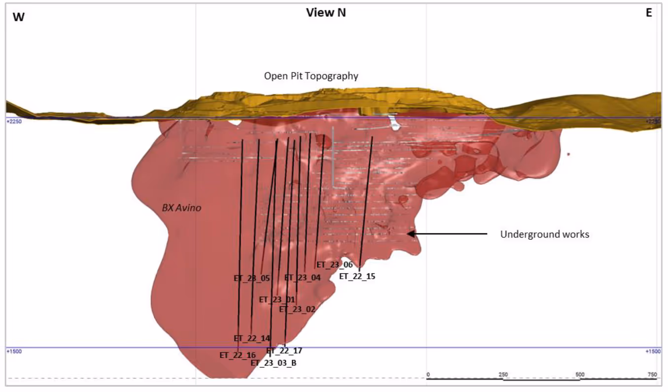 Avino Silver & Gold Mines Ltd. (ASM: TSX/NYSE American, GV6: FSE, “Avino” or “the Company”) releases the results of ten drill holes from below Level 17, the current deepest workings of the mine. The current drill campaign has extended our knowledge of the continuity of the Avino Vein to a distance of 500 meters downdip of the lowest mining level. The exploration program is designed to test the continuity and to improve our understanding of the potential for deeper mineralization. The extent of the Avino Vein has been established to be at least 1,100 metres downdip from surface outcrop. Additionally, a previously undiscovered breccia vein was intersected approximately 15 to 30 metres below the Avino Vein in the footwall intrusive rocks. This unit has revealed three good intercepts (labelled INT-BX in Table 1) including a 35 cm intercept in ET-23-05 yielding 1,165 AgEq g/t. These intercepts warrant further follow-up to see if it can be correlated with historic intercepts in the footwall of the Avino Vein to determine potential continuity.