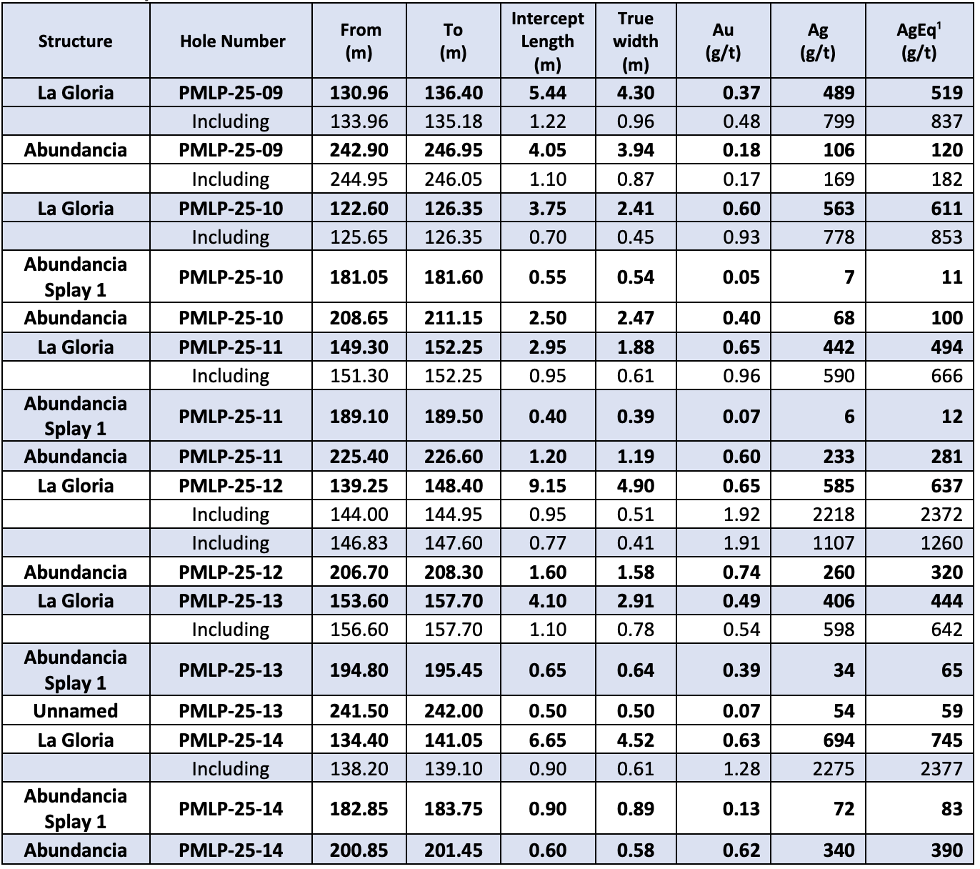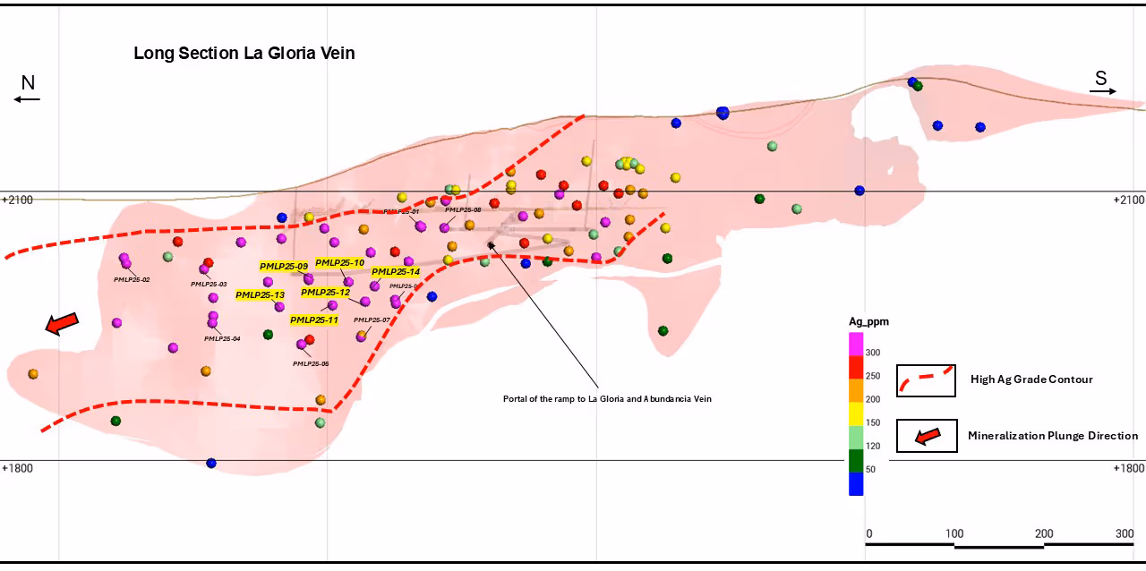 - Hole PMLP 25-14 at Gloria: 694 g/t Ag and 0.63 g/t Au over 4.52 metres true width